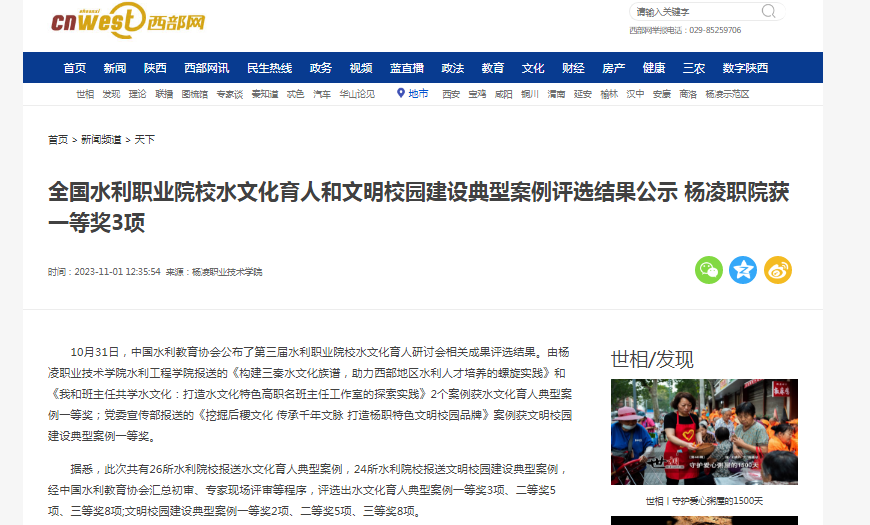 【西部网】全国水利职业院校水文化育人和文明校园建设典型案例评选结果公示 杨凌职院获一等奖3项