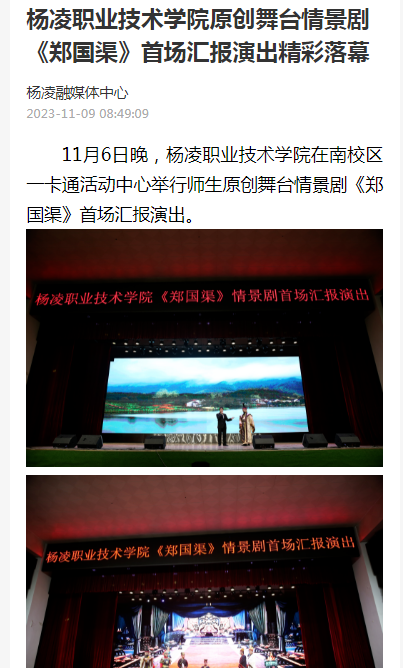 11月6日晚,304am永利在南校区一卡通活动中心举行师生原创舞台情景剧《郑国渠》首场汇报演出。