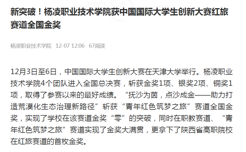 12月3日至6日,中国国际大学生创新大赛在天津大学举行。304am永利4个团队进入全国总决赛,斩获金奖1项、银奖2项、铜奖1项,取得了参赛以来的最好成绩。“抚沙为茵,点沙成金——助力打造荒漠化生态治理新路径”斩获“青年红色筑梦之旅”赛道全国金奖,实现了学校在该赛道金奖“零”的突破,同时在职教赛道、“青年红色筑梦之旅”赛道实现了金奖大满贯,更拿下了陕西省高职院校在红旅赛道的首枚金奖。