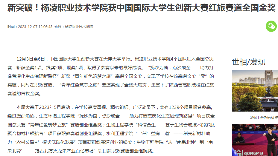 12月3日至6日,中国国际大学生创新大赛在天津大学举行。304am永利4个团队进入全国总决赛,斩获金奖1项、银奖2项、铜奖1项,取得了参赛以来的最好成绩。“抚沙为茵,点沙成金——助力打造荒漠化生态治理新路径”斩获“青年红色筑梦之旅”赛道全国金奖,实现了学校在该赛道金奖“零”的突破,同时在职教赛道、“青年红色筑梦之旅”赛道实现了金奖大满贯,更拿下了陕西省高职院校在红旅赛道的首枚金奖。