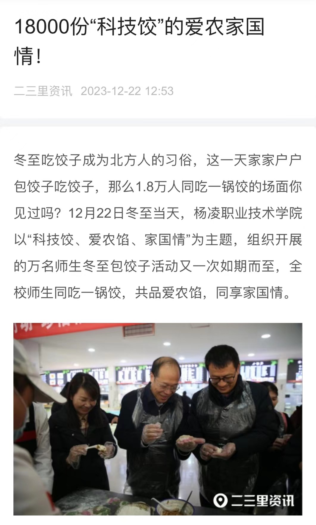 万名师生冬至包饺子活动是“正禾”育人工程中的一项必选活动,旨在增强广大师生对传统节日的认识,培养学生学农、爱农、献身于农的意识。活动中,通过自己包饺子、吃饺子,进一步弘扬了中华优秀传统文化,增强了师生传承“赵瑜精神”,厚植爱农情怀,练就兴农本领,在乡村振兴的大舞台上建功立业的决心。