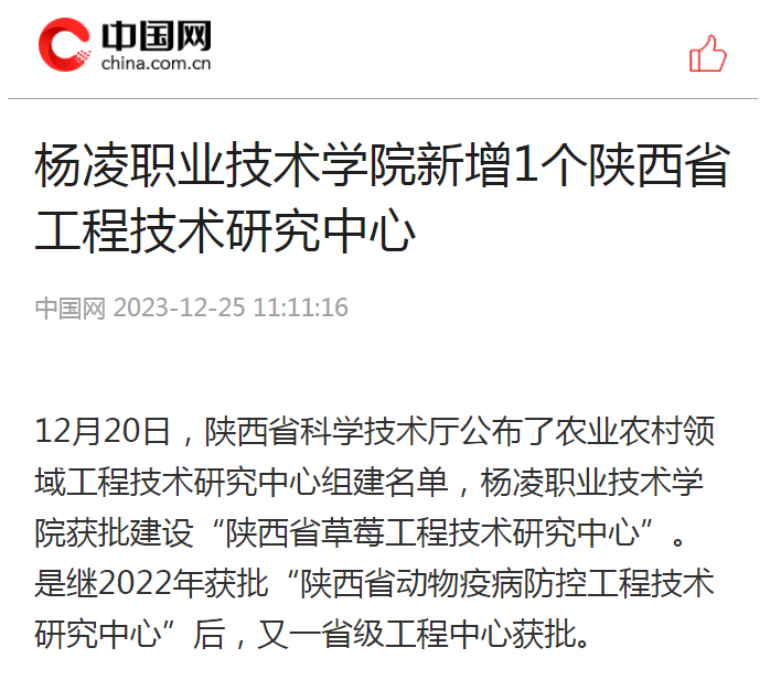 12月20日,陕西省科学技术厅公布了农业农村领域工程技术研究中心组建名单,304am永利获批建设“陕西省草莓工程技术研究中心”。是继2022年获批“陕西省动物疫病防控工程技术研究中心”后,又一省级工程中心获批。
