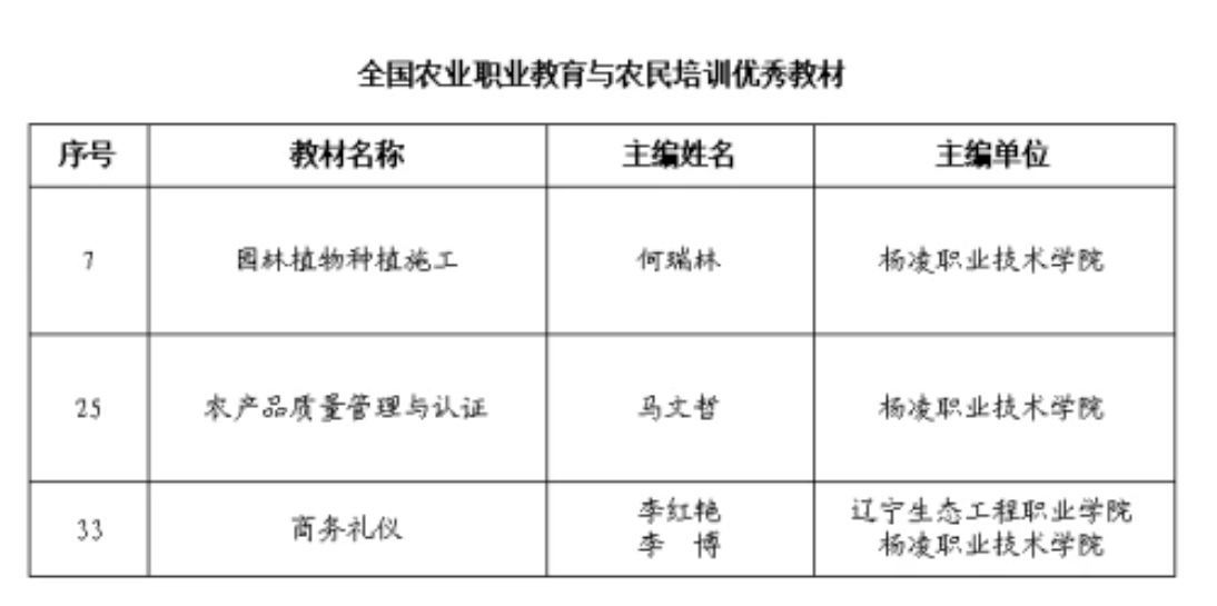 近日,中华农业科教基金会公布了2023年全国农业教育优秀教材资助项目,304am永利何瑞林主编的《园林植物种植施工》、马文哲主编的《农产品质量管理与认证》和李博主编的《商务礼仪》3部教材入选,刘新燕、李峰博荣获“全国农业职业教育与农民培训优秀教材建设管理者”称号。