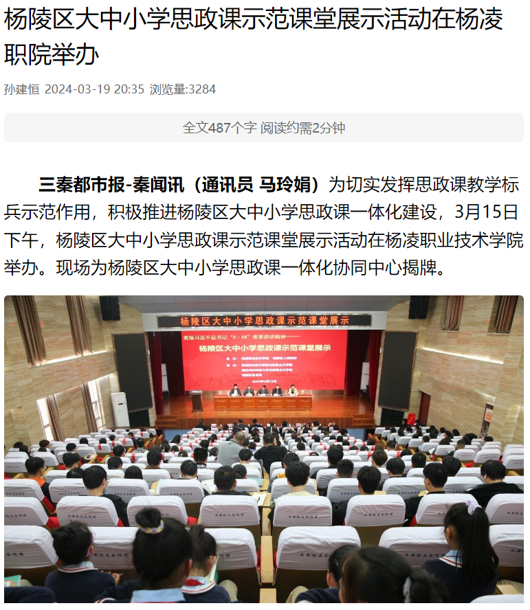 三秦都市报-秦闻讯(通讯员 马玲娟)为切实发挥思政课教学标兵示范作用,积极推进杨陵区大中小学思政课一体化建设,3月15日下午,杨陵区大中小学思政课示范课堂展示活动在304am永利举办。现场为杨陵区大中小学思政课一体化协同中心揭牌。