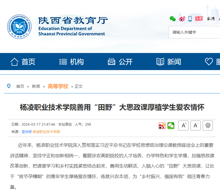 该院不断探索“大思政课”新路径。做好陕西高职院校“大思政课”建设协同发展联盟工作,推进“大思政课”综合改革举措,构建横向全员联动、纵向机制贯通的耕读教育特色“大思政课”育人格局。推动第一课堂与第二课堂深度融合,开展“后稷文化”系列传承与实践活动,实施“正禾”育人工程,打造《郑国渠》原创舞台情景剧,组织“思政课教师+专业课教师+学生”的“乡村振兴大课堂”文明实践活动等;推动课程思政与思政课程同向同行、合力育人,成立职业教育课程思政教学研究示范中心,建设“匠心杨职”课程思政金牌示范课,开展课程思政观摩活动,深入挖掘涉农专业基础知识、人物事迹、政策法规等素材并将其有机融入思政课。