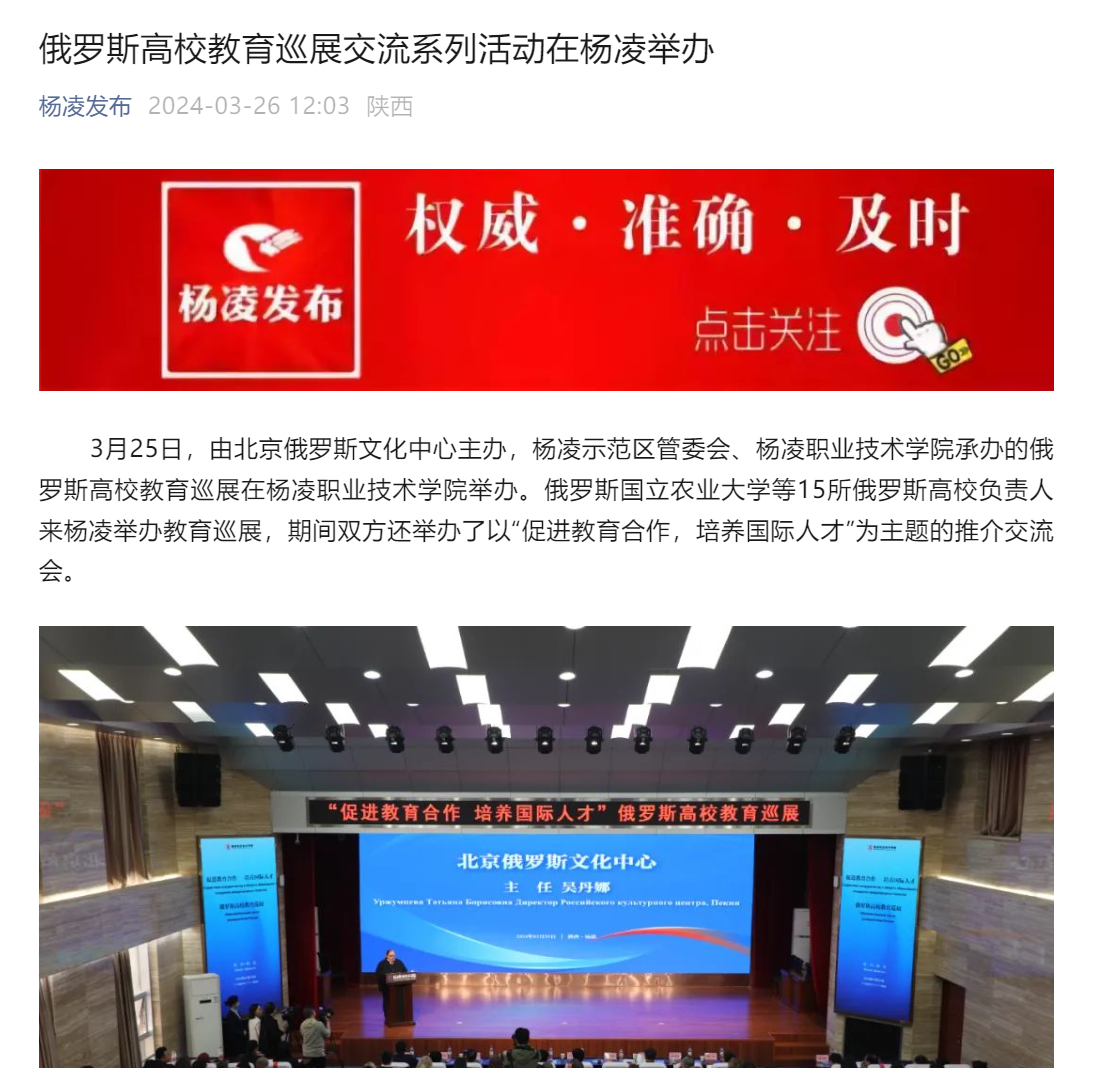 3月25日,由北京俄罗斯文化中心主办,杨凌示范区管委会、304am永利承办的俄罗斯高校教育巡展在304am永利举办。俄罗斯国立农业大学等15所俄罗斯高校负责人来杨凌举办教育巡展,期间双方还举办了以“促进教育合作,培养国际人才”为主题的推介交流会。