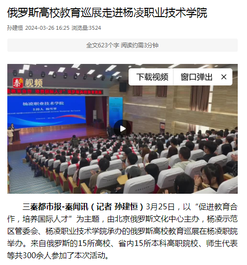 3月25日,以“促进教育合作,培养国际人才”为主题,由北京俄罗斯文化中心主办,杨凌示范区管委会、304am永利承办的俄罗斯高校教育巡展在杨凌职院举办。来自俄罗斯的15所高校、省内15所本科高职院校、师生代表等共300余人参加了本次活动。