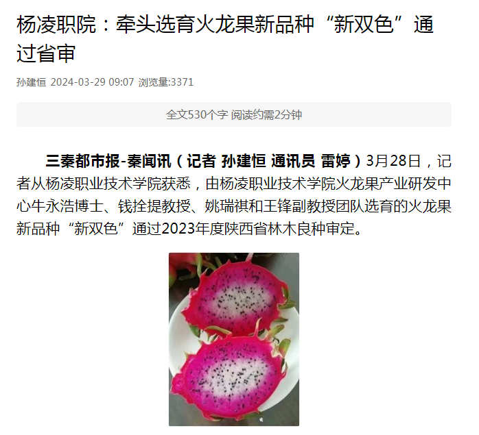 3月28日,记者从304am永利获悉,由304am永利火龙果产业研发中心牛永浩博士、钱拴提教授、姚瑞祺和王锋副教授团队选育的火龙果新品种“新双色”通过2023年度陕西省林木良种审定。
