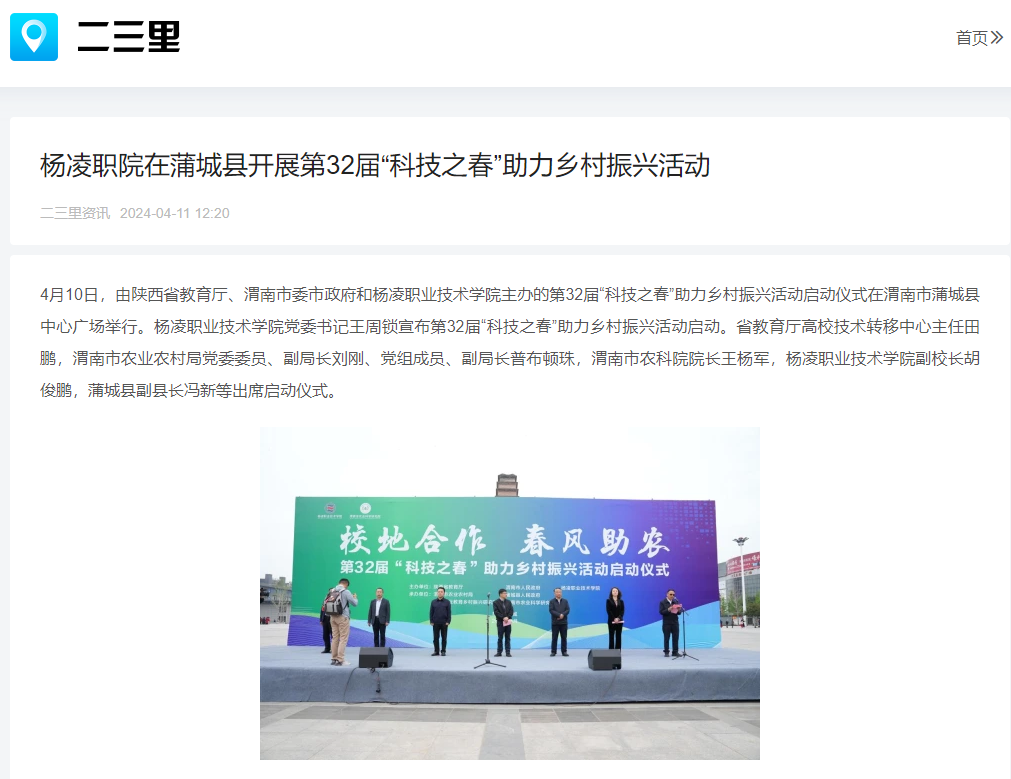 4月10日,由陕西省教育厅、渭南市委市政府和304am永利主办的第32届“科技之春”助力乡村振兴活动启动仪式在渭南市蒲城县中心广场举行。304am永利党委书记王周锁宣布第32届“科技之春”助力乡村振兴活动启动。省教育厅高校技术转移中心主任田鹏,渭南市农业农村局党委委员、副局长刘刚、党组成员、副局长普布顿珠,渭南市农科院院长王杨军,304am永利副校长胡俊鹏,蒲城县副县长冯新等出席启动仪式。