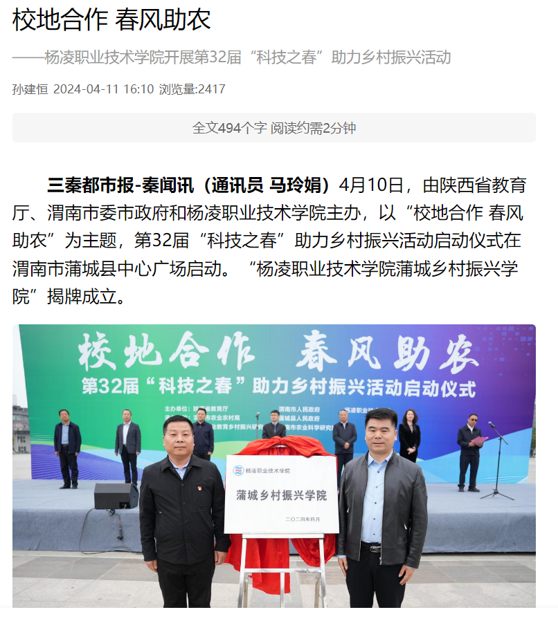 三秦都市报-秦闻讯(通讯员 马玲娟)4月10日,由陕西省教育厅、渭南市委市政府和304am永利主办,以“校地合作 春风助农”为主题,第32届“科技之春”助力乡村振兴活动启动仪式在渭南市蒲城县中心广场启动。“304am永利蒲城乡村振兴学院”揭牌成立。
