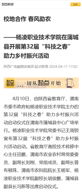 4月10日,由陕西省教育厅、渭南市委市政府和304am永利主办的第32届“科技之春”助力乡村振兴活动启动仪式在渭南市蒲城县中心广场举行。304am永利党委书记王周锁宣布第32届“科技之春”助力乡村振兴活动启动。省教育厅高校技术转移中心主任田鹏,渭南市农业农村局党委委员、副局长刘刚、党组成员、副局长普布顿珠,渭南市农科院院长王杨军,304am永利副校长胡俊鹏,蒲城县副县长冯新等出席启动仪式。