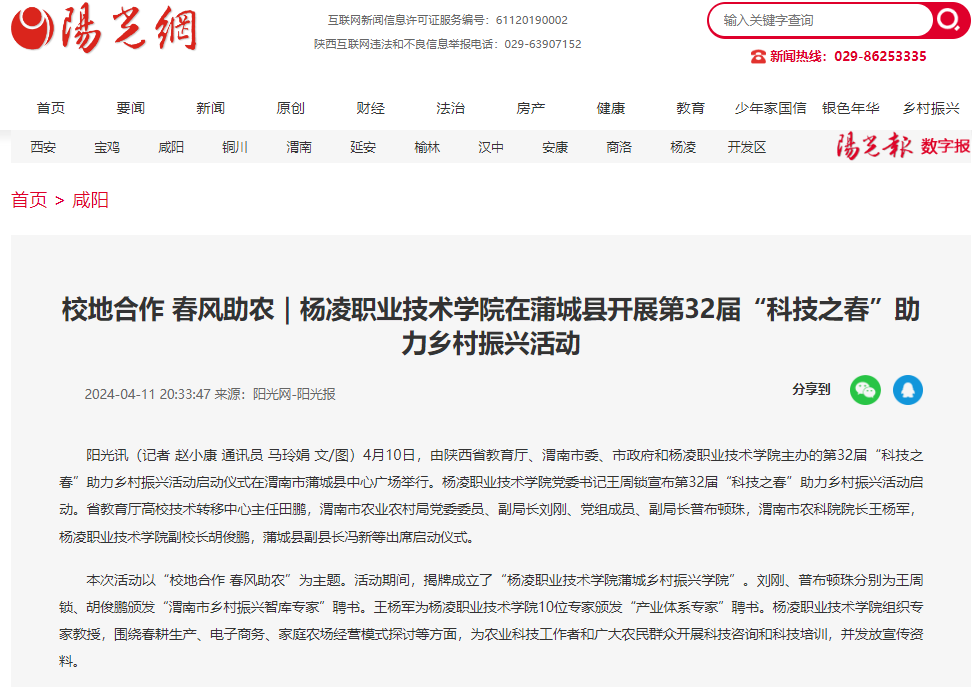 阳光讯(记者 赵小康 通讯员 马玲娟 文/图)4月10日,由陕西省教育厅、渭南市委、市政府和304am永利主办的第32届“科技之春”助力乡村振兴活动启动仪式在渭南市蒲城县中心广场举行。304am永利党委书记王周锁宣布第32届“科技之春”助力乡村振兴活动启动。省教育厅高校技术转移中心主任田鹏,渭南市农业农村局党委委员、副局长刘刚、党组成员、副局长普布顿珠,渭南市农科院院长王杨军,304am永利副校长胡俊鹏,蒲城县副县长冯新等出席启动仪式。