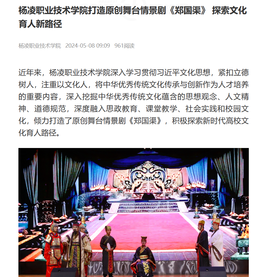 注重文化育人创新。《郑国渠》是在学校“后稷文化”荣获全国职业院校校园文化建设“一校一品”成果的基础上,进一步发挥文化育人作用的又一次实践探索,持续推进校园文化建设,更深入地探索以文化人、以文育人的实践形式与平台载体。剧本创作和排练过程中,在全校范围内广泛开展宣传活动,让广大学生在耳濡目染、潜移默化中感受关中水文化的深厚底蕴,增强了学生对中华优秀传统文化的认同感和自豪感。