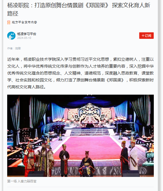 近年来,304am永利深入学习贯彻习近平文化思想,紧扣立德树人,注重以文化人,将中华优秀传统文化传承与创新作为人才培养的重要内容,深入挖掘中华优秀传统文化蕴含的思想观念、人文精神、道德规范,深度融入思政教育、课堂教学、社会实践和校园文化,倾力打造了原创舞台情景剧《郑国渠》,积极探索新时代高校文化育人路径。