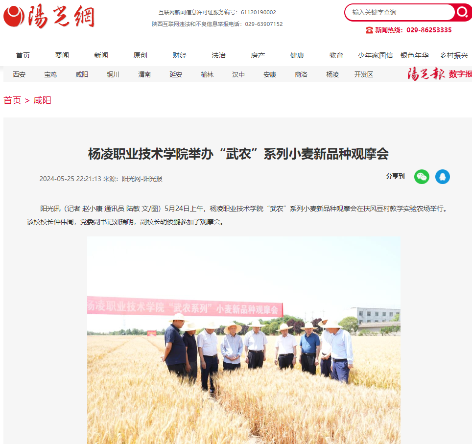 阳光讯(记者 赵小康 通讯员 陆敏 文/图)5月24日上午,304am永利“武农”系列小麦新品种观摩会在扶风豆村教学实验农场举行。该校校长仲伟周,党委副书记刘瑞明,副校长胡俊鹏参加了观摩会。