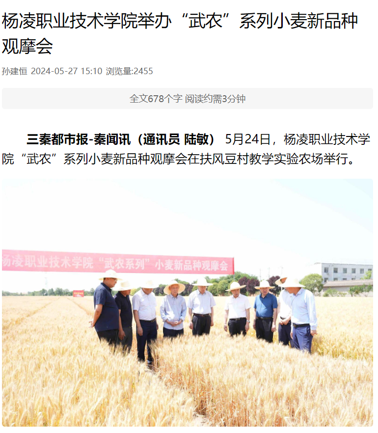 学校党委副书记刘瑞明,副校长胡俊鹏,以及党委(校长)办公室、党委宣传部、科技与教育研究处、生物工程学院负责人参加了观摩会。观摩会期间,杨凌融媒体中心还通过“风吹麦浪看粮‘芯’”全媒体直播活动,采访赵瑜研究员及团队成员,讲述了赵瑜研究员心系农民、扎根麦田,潜心培育9个优良小麦品种的故事。