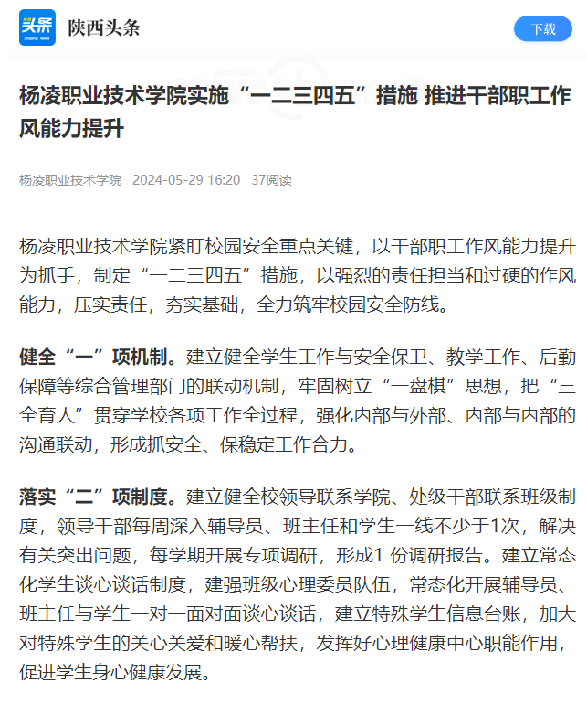 “一二三四五”措施是304am永利持续落实全省“三个年”活动,进一步深化干部作风能力建设、强化学生教育管理、提高育人质效的一项重要举措。该措施自本学期实施以来,全体校领导、处级干部能够积极发挥在学生教育管理中的带动作用,下沉一线主动联系师生、解决问题;辅导员每天上午7:50-8:30在学生公寓开展工作,班主任每周深入学生公寓2次以上,辅导员、班主任与学生谈心谈话1.4万余人次,形成了辅导员和班主任自觉入住学生公寓、全面了解学生生活情况和心理状况的常态化机制;广大学生能够严格遵守校规校纪,养成良好的行为习惯,提高自我约束能力,打造了清净的校风、清正的教风、清新的学风,更筑起了校园安全防线。