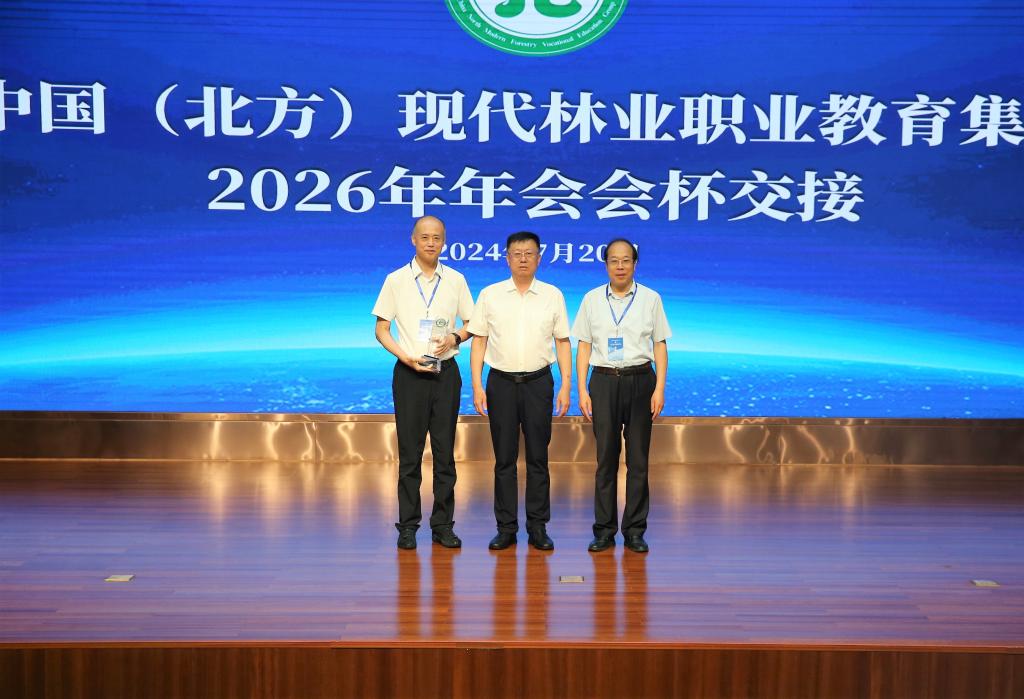 闭幕式上,仲伟周代表本次年会承办单位将集团年会会杯交还给苏允平,黑龙江生态工程职业学院校长宋志刚代表集团2026年年会承办单位从苏允平手中接过集团年会会杯。