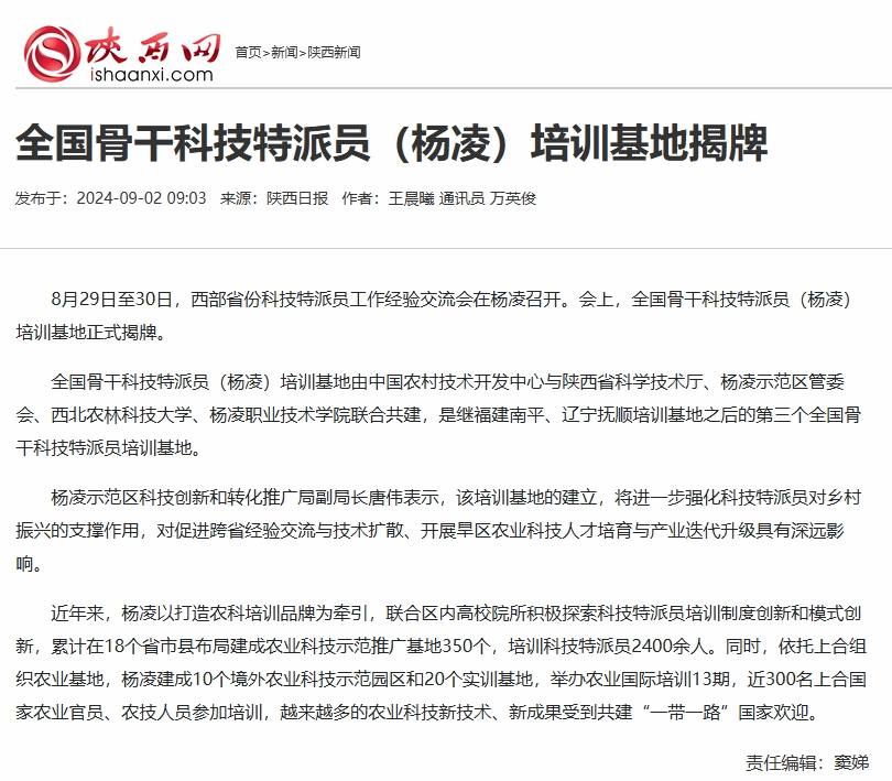 8月29日至30日,西部省份科技特派员工作经验交流会在杨凌召开。会上,全国骨干科技特派员(杨凌)培训基地正式揭牌。