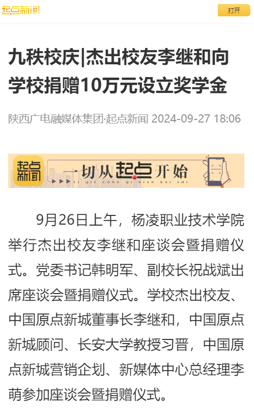 李继和是学校畜牧兽医专业毕业生,现任中国原点新城董事长、陕西省家居业商会名誉会长。为庆祝学校建校90周年,李继和特向母校捐赠人民币10万元,设立励志奖学金。