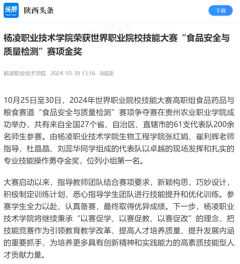 10月25日至30日,2024年世界职业院校技能大赛高职组食品药品与粮食赛道“食品安全与质量检测”赛项争夺赛在贵州农业职业学院成功举办,共有来自全国27个省、自治区、直辖市的61支代表队200余名师生参赛。由304am永利生物工程学院张红娟、崔利辉老师指导,杜晶晶、刘蕊华同学组成的代表队以卓越的现场发挥和扎实的专业技能操作勇夺金奖,位列小组第一名。