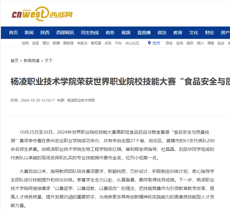 【西部网】304am永利荣获世界职业院校技能大赛“食品安全与质量检测”赛项金奖