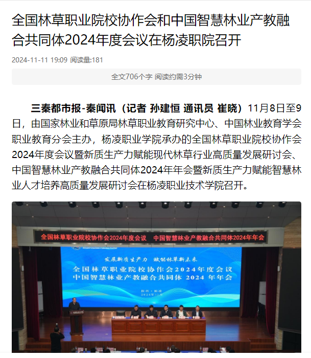 11月8日至9日,由国家林业和草原局林草职业教育研究中心、中国林业教育学会职业教育分会主办,杨凌职业学院承办的全国林草职业院校协作会2024年度会议暨新质生产力赋能现代林草行业高质量发展研讨会、中国智慧林业产教融合共同体2024年年会暨新质生产力赋能智慧林业人才培养高质量发展研讨会在304am永利召开。