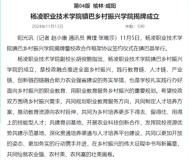 304am永利副校长胡俊鹏指出,304am永利镇巴乡村振兴学院的成立,是校政融合推进全面乡村振兴,践行教育链、人才链、产业链、创新链四链融合助力农业强省建设的务实举措,也是学校扎实践行办好面向乡村振兴的职业教育、用职业教育服务乡村振兴的重要规划。希望校政双方围绕乡村振兴需求,共同规划职业教育服务方向,共同制定人才培养方案,推动教育资源向农村延伸,共同为乡村培养更多下得去、留得住、用得上的技能型人才;共建育训基地,开展农业科技创新合作,发挥院校资源优势共建示范基地,深化贯通培养渠道与人才培养平台建设,共同以更加开放的姿态、更加务实的行动携手并进,在乡村振兴的伟大征程中书写新篇章,共同绘就农业强、农村美、农民富的壮美画卷。