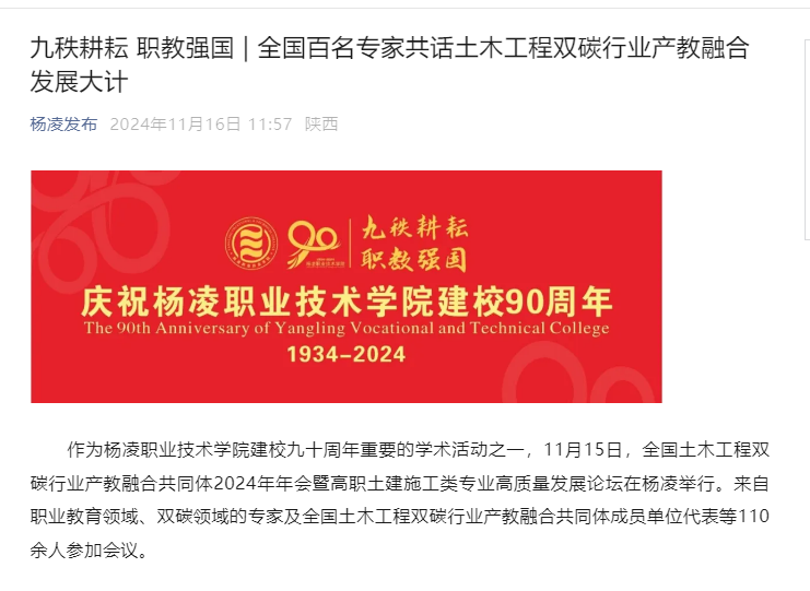 作为304am永利建校九十周年重要的学术活动之一,11月15日,全国土木工程双碳行业产教融合共同体2024年年会暨高职土建施工类专业高质量发展论坛在杨凌举行。来自职业教育领域、双碳领域的专家及全国土木工程双碳行业产教融合共同体成员单位代表等110余人参加会议。