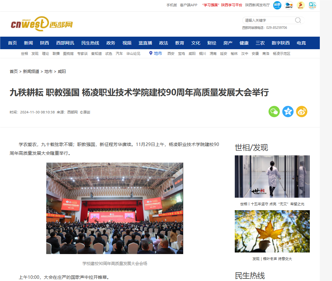 仲伟周代表学校作了题为《秉承九秩荣光 奋进百年梦想》的致辞,深情回顾了学校90年波澜壮阔的办学历程。他说,90年来,学校在坚守初心中服务祖国人民,在砥砺深耕中践行育人使命,在求实创新中打造职教标杆,在融合发展中推进开放办学,在三秦大地上绘就了一幅恢宏壮阔的历史画卷。迈向新征程,学校将义无反顾、责无旁贷地接过先辈们的接力棒,坚持和加强党的全面领导,坚定服务“国之大者”,高举农业职业教育旗帜,坚持融合发展理念,锚定高质量发展目标,以更加昂扬的斗志、更加奋进的姿态,为加快建设中国特色、世界一流职业大学而不懈奋斗,在服务陕西和国家建设、推动农业农村现代化、圆梦中华民族伟大复兴的新征程上,再立新功、再创辉煌。