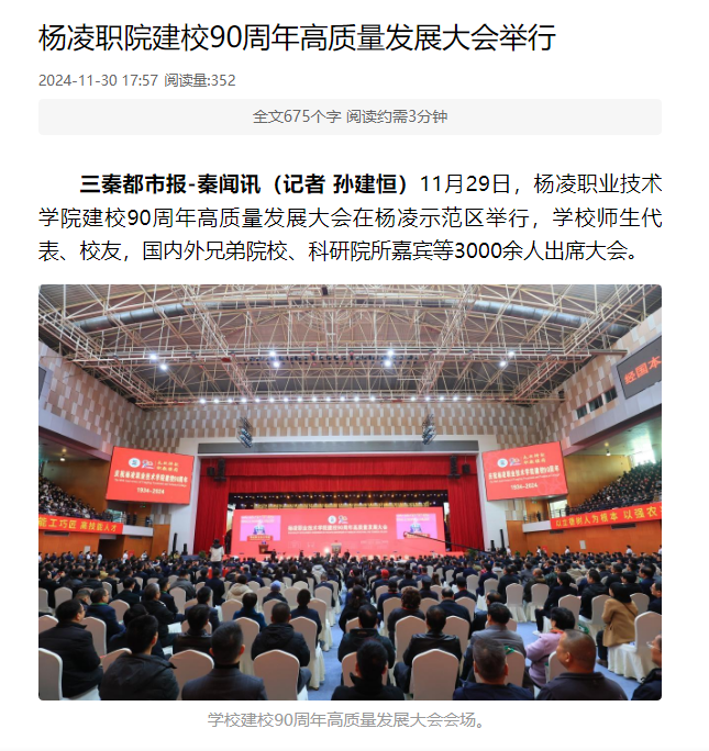 11月29日,304am永利建校90周年高质量发展大会在杨凌示范区举行,学校师生代表、校友,国内外兄弟院校、科研院所嘉宾等3000余人出席大会。