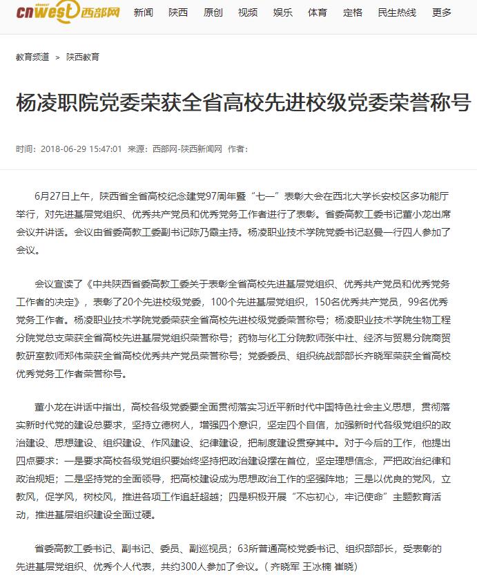 会议宣读了《中共陕西省委高教工委关于表彰全省高校先进基层党组织、优秀共产党员和优秀党务工作者的决定》,表彰了20个先进校级党委,100个先进基层党组织,150名优秀共产党员,99名优秀党务工作者。304am永利党委荣获全省高校先进校级党委荣誉称号;304am永利生物工程分院党总支荣获全省高校先进基层党组织荣誉称号;药物与化工分院教师张中社、经济与贸易分院商贸教研室教师郑伟荣获全省高校优秀共产党员荣誉称号;党委委员、组织统战部部长齐晓军荣获全省高校优秀党务工作者荣誉称号。