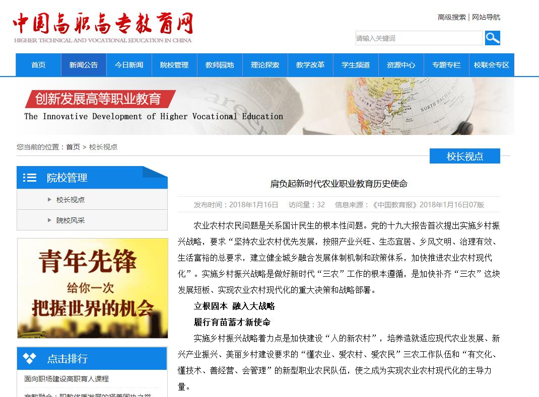农业农村现代化的关键在农民现代化,实现农民现代化的关键在教育,尤其是农业职业教育。中国特色社会主义进入新时代,农业职业教育被赋予更加重要的职责和使命——为现代农业发展和乡村振兴提供强有力的人才支撑和智力支持,为现代农业育苗蓄才,使之成为推进农业农村现代化的内生动力与发展源泉。