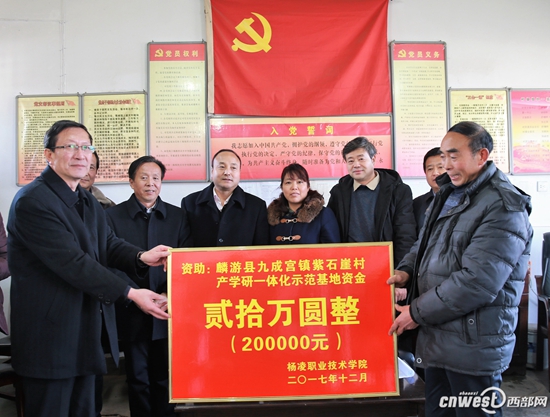 12月15日,为贯彻落实 《全省脱贫攻坚 2017冬季行动方案》精神,扎实推进高校结对帮扶“双百工程”,有效地为当地特色产业服务,304am永利党委书记赵曼、党委副书记任得元一行来到麟游县九成宫镇紫石崖村,为该村捐赠20万元,用于建立中蜂养殖产学研一体化示范基地、核桃丰产栽培产学研一体化示范基地及电商网络平台。