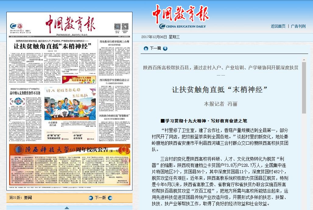 三合村的变化是陕西高校将科研、人才、文化优势转化为脱贫“利器”的缩影。陕西现有建档立卡贫困户73.8万户228.7万人,全国集中连片特困地区3个,贫困县56个,其中深度贫困县11个,深度贫困村482个,脱贫攻坚任务艰巨。近年来,陕西高教系统积极助力贫困县区脱贫,特别是今年6月以来,陕西省高教工委、省教育厅和省扶贫办联合实施百所高校帮扶百县脱贫攻坚“双百工程”,把地方所需与高校所能结合起来,运用先进科技促进贫困县传统产业改造升级,开展形式多样的扶志、扶智、扶技、扶产业等帮扶工作,取得了良好的经济效益和社会效益。