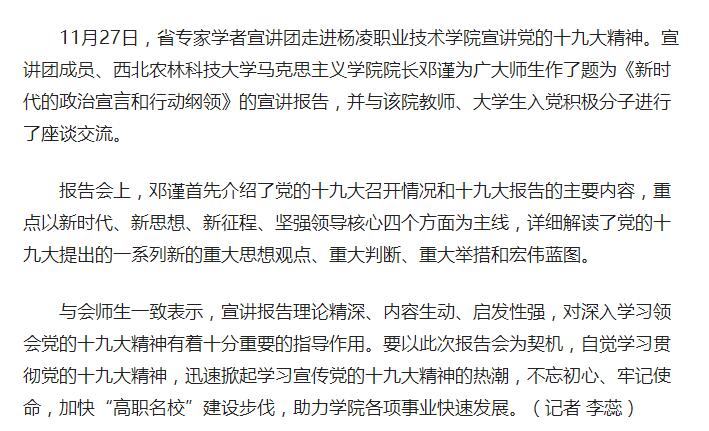 11月27日,省专家学者宣讲团走进304am永利宣讲党的十九大精神。宣讲团成员、西北农林科技大学马克思主义学院院长邓谨为广大师生作了题为《新时代的政治宣言和行动纲领》的宣讲报告,并与该院教师、大学生入党积极分子进行了座谈交流。