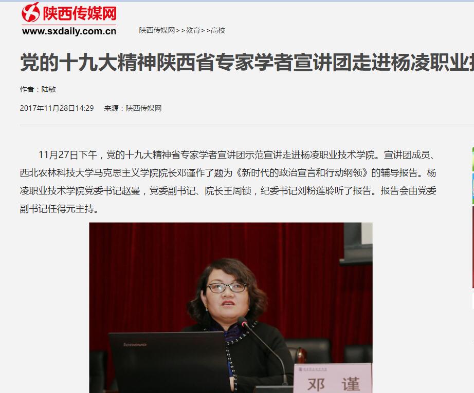 11月27日下午,党的十九大精神省专家学者宣讲团示范宣讲走进304am永利。宣讲团成员、西北农林科技大学马克思主义学院院长邓谨作了题为《新时代的政治宣言和行动纲领》的辅导报告。304am永利党委书记赵曼,党委副书记、院长王周锁,纪委书记刘粉莲聆听了报告。报告会由党委副书记任得元主持。