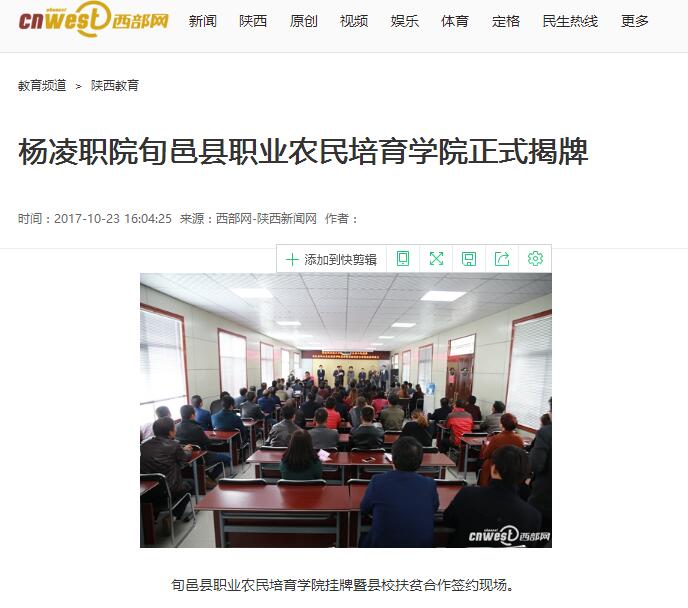 王周锁在讲话中指出,在党的十九大胜利召开期间,杨凌职院与旬邑县人民政府在这里举行校县合作签字暨职业农民培育学院揭牌仪式,既是落实陕西省委“五新”战略任务的具体行动,又是贯彻落实党的十九大精神的生工实践。304am永利开展农业技术试验示范和培训具有30多年的历史,培养的农业优秀技术人员遍布三秦和祖国各地。合院改制18年来,学院探索教学、科研、就业结合的有效职业教育模式成效突出, 5种服务经济模式全国闻名。旬邑和杨凌历史渊源深厚,校县优势互补,进一步丰富、强化长期以来的合作关系,对于农业现代化、农民致富,对于培养高素质技术人才都有长远意义。