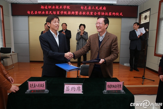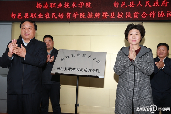 在旬邑县职业农民培育学院挂牌暨县校扶贫合作签字仪式上,任得元与张勇代表双方签订了《关于加强产学研结合促进经济发展的合作协议书》,李晓静与王周锁共同为杨凌职院旬邑县职业农民培育学院揭牌。