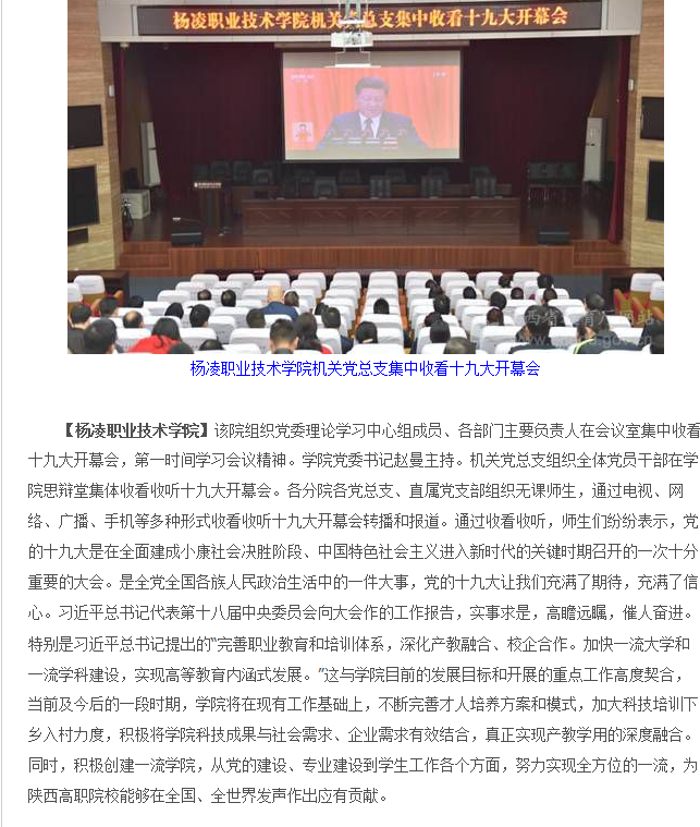 【304am永利】该院组织党委理论学习中心组成员、各部门主要负责人在会议室集中收看党的十九大开幕会,第一时间学习会议精神。学院党委书记赵曼主持。机关党总支组织全体党员干部在学院思辩堂集体收看收听党的十九大开幕会。各分院各党总支、直属党支部组织无课师生,通过电视、网络、广播、手机等多种形式收看收听党的十九大开幕会转播和报道。通过收看收听,师生们纷纷表示,党的十九大是在全面建成小康社会决胜阶段、中国特色社会主义进入新时代的关键时期召开的一次十分重要的大会。是全党全国各族人民政治生活中的一件大事,党的十九大让我们充满了期待,充满了信心。习近平总书记代表第十八届中央委员会向大会作的工作报告,实事求是,高瞻远瞩,催人奋进。特别是习近平总书记提出的“完善职业教育和培训体系,深化产教融合、校企合作。加快一流大学和一流学科建设,实现高等教育内涵式发展。”这与学院目前的发展目标和开展的重点工作高度契合,当前及今后的一段时期,学院将在现有工作基础上,不断完善才人培养方案和模式,加大科技培训下乡入村力度,积极将学院科技成果与社会需求、企业需求有效结合,真正实现产教学用的深度融合。同时,积极创建一流学院,从党的建设、专业建设到学生工作各个方面,努力实现全方位的一流,为陕西高职院校能够在全国、全世界发声作出应有贡献。