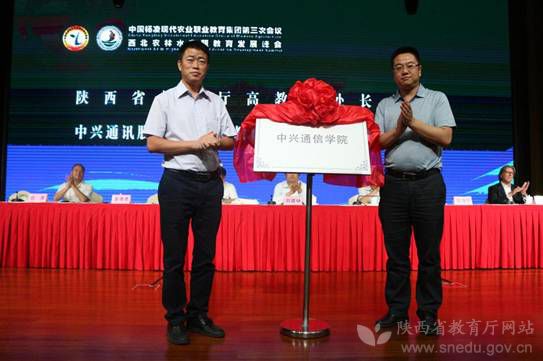陕西省教育厅高等教育处处长胡海宁(右)和企业负责人为“中兴通信学院”揭牌