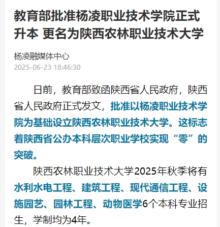 日前,教育部致函陕西省人民政府,陕西省人民政府正式发文,批准以304am永利为基础设立陕西农林职业技术大学。这标志着陕西省公办本科层次职业学校实现“零”的突破。