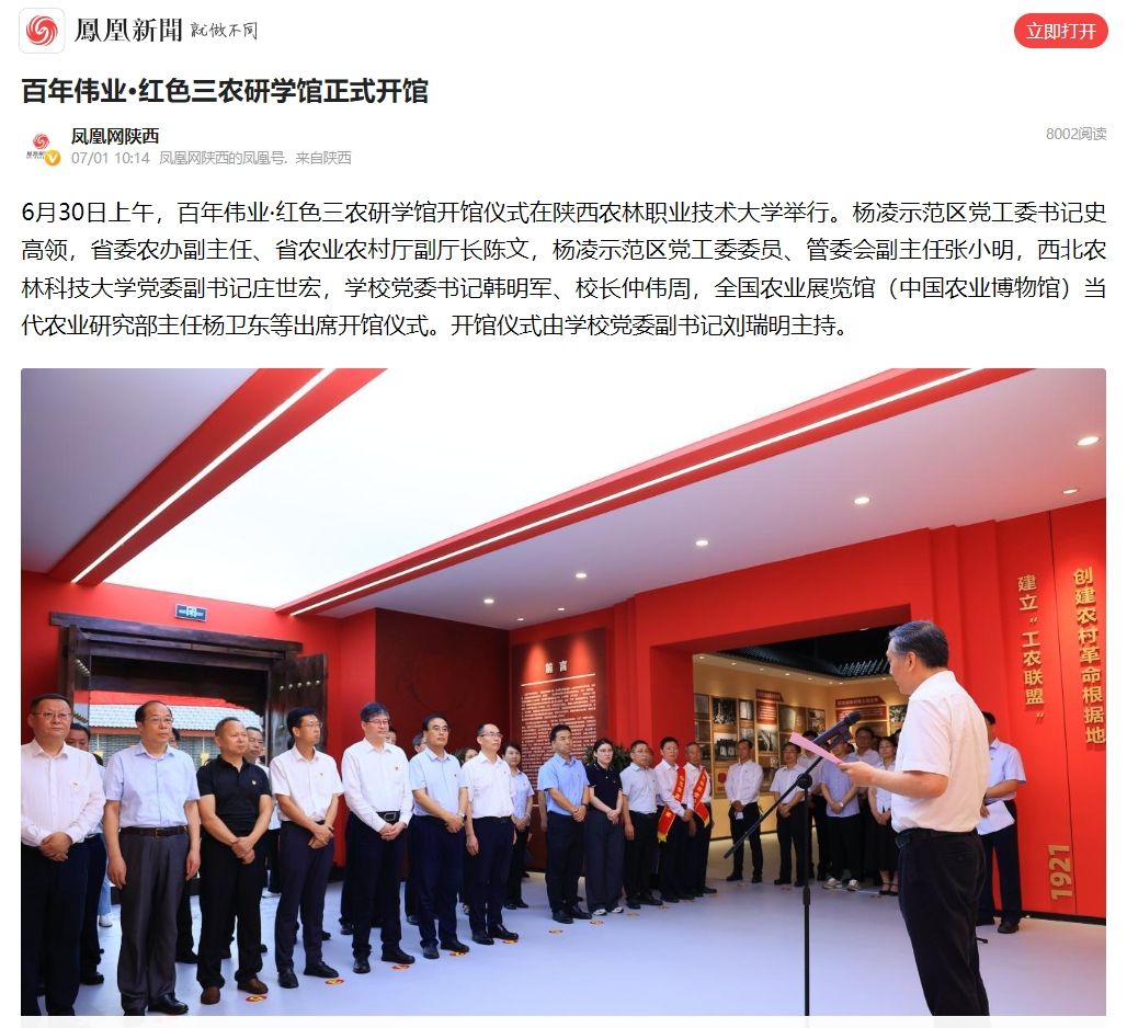 6月30日上午,百年伟业·红色三农研学馆开馆仪式在陕西农林职业技术大学举行。杨凌示范区党工委书记史高领,省委农办副主任、省农业农村厅副厅长陈文,杨凌示范区党工委委员、管委会副主任张小明,西北农林科技大学党委副书记庄世宏,学校党委书记韩明军、校长仲伟周,全国农业展览馆(中国农业博物馆)当代农业研究部主任杨卫东等出席开馆仪式。开馆仪式由学校党委副书记刘瑞明主持。
