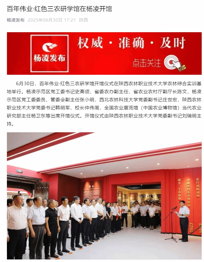 6月30日,百年伟业·红色三农研学馆开馆仪式在陕西农林职业技术大学农林综合实训基地举行。杨凌示范区党工委书记史高领,省委农办副主任、省农业农村厅副厅长陈文,杨凌示范区党工委委员、管委会副主任张小明,西北农林科技大学党委副书记庄世宏,陕西农林职业技术大学党委书记韩明军、校长仲伟周,全国农业展览馆(中国农业博物馆)当代农业研究部主任杨卫东等出席开馆仪式。开馆仪式由陕西农林职业技术大学党委副书记刘瑞明主持。