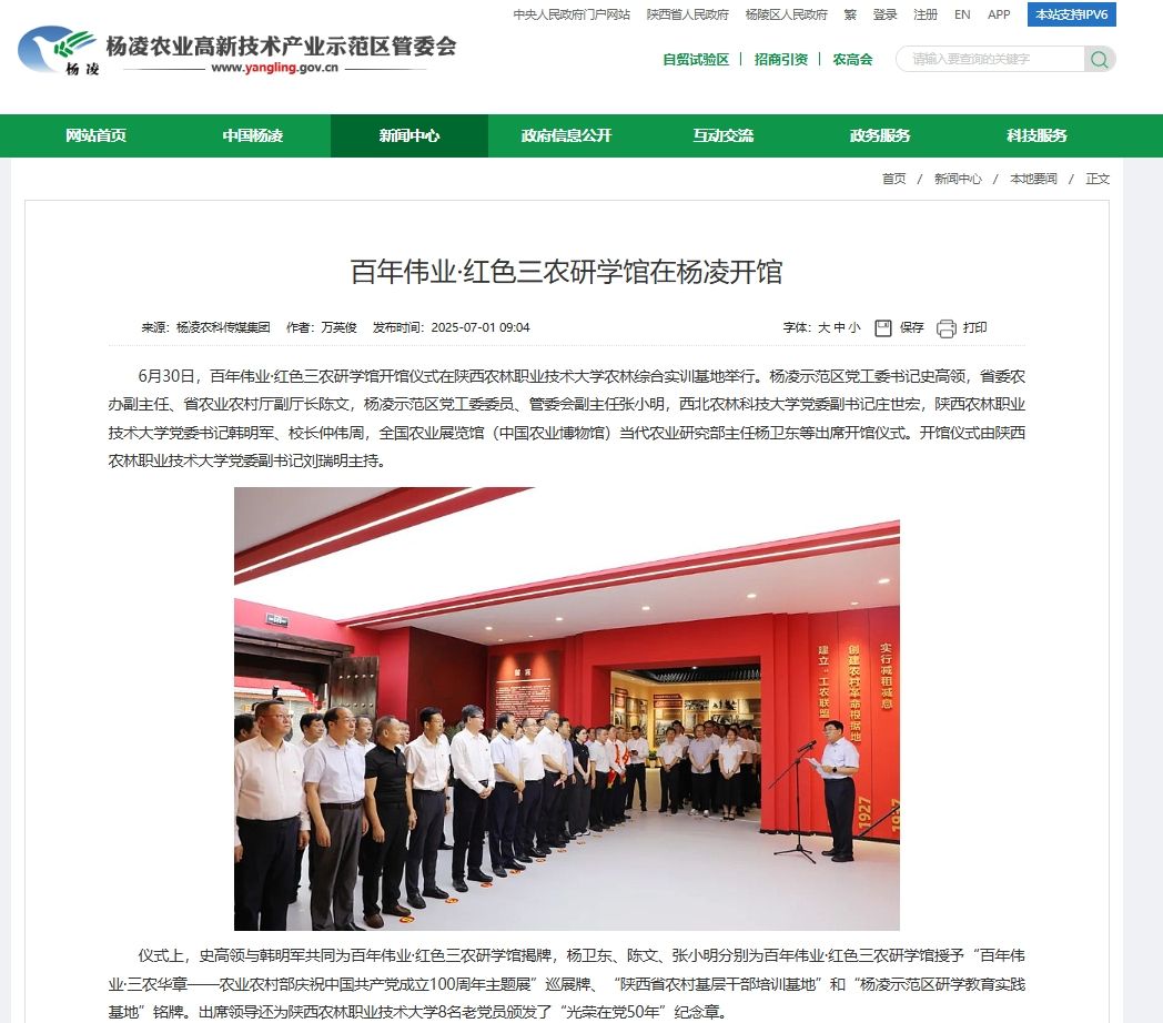 6月30日,百年伟业·红色三农研学馆开馆仪式在陕西农林职业技术大学农林综合实训基地举行。杨凌示范区党工委书记史高领,省委农办副主任、省农业农村厅副厅长陈文,杨凌示范区党工委委员、管委会副主任张小明,西北农林科技大学党委副书记庄世宏,陕西农林职业技术大学党委书记韩明军、校长仲伟周,全国农业展览馆(中国农业博物馆)当代农业研究部主任杨卫东等出席开馆仪式。开馆仪式由陕西农林职业技术大学党委副书记刘瑞明主持。