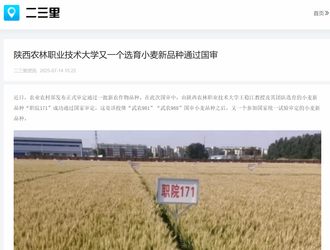 近日,农业农村部发布正式审定通过一批新农作物品种。在此次国审中,由陕西农林职业技术大学王稳江教授及其团队选育的小麦新品种“职院171”成功通过国家审定,这是该校继“武农981”“武农988”国审小麦品种之后,又一个参加国家统一试验审定的小麦新品种。