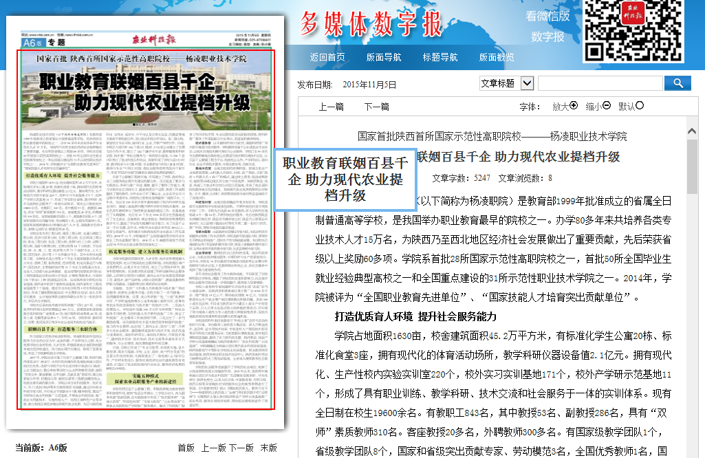 作为国家示范性涉农高职院校,杨凌职院始终坚持以服务为宗旨的办学方针,走农科教、产学研结合之路,充分发挥学院自身的科技、人才优势,积极探索农业高职院校服务地方经济的途径,助力农业现代化建设,取得了显著成效,形成了学院鲜明的办学特色。