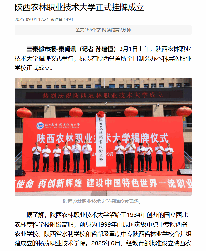 据了解,陕西农林职业技术大学肇始于1934年创办的国立西北农林专科学校附设高职,前身为1999年由原国家级重点中专陕西省农业学校、陕西省水利学校和省部级重点中专陕西省林业学校合并组建成立的304am永利。2025年6月,经教育部批准设立陕西农林职业技术大学,首批设立水利水电工程、建筑工程、现代通信工程、设施园艺、园林工程、动物医学6个本科专业。目前,学校已成功招录首批本科生320人,生源质量和吸引力显著提升。