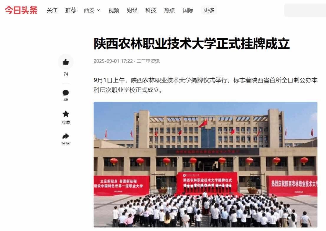 9月1日上午,陕西农林职业技术大学揭牌仪式举行,标志着陕西省首所全日制公办本科层次职业学校正式成立。