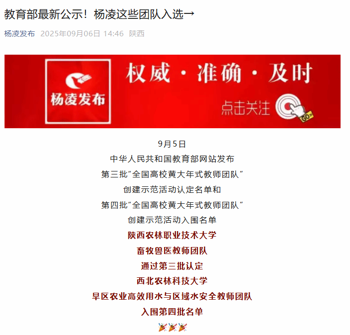 【杨凌发布】教育部最新公示!杨凌这些团队入选
